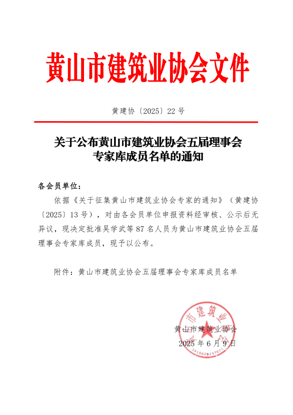 关于公布黄山市建筑业协会五届理事会专家库成员名单的通知