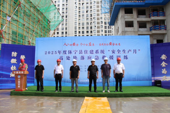 6 月 26 日下午,2025 年度休宁县住建系统 “安全生产月” 高处坠落应急救援演练在黄山方圆控股集团有限公司承建的萝宁广场 5#、6#、15# 楼及地下车库工程施工现场举行。本次活动由休宁县住房和城乡建设局主办,休宁县建筑行业协会协办,黄山方圆控股集团有限公司承办,县住建局党组书记、局长胡政华,副局长倪胜利出席活动并讲话,县建筑行业协会及县内各建筑企业代表共80多人出席活动。